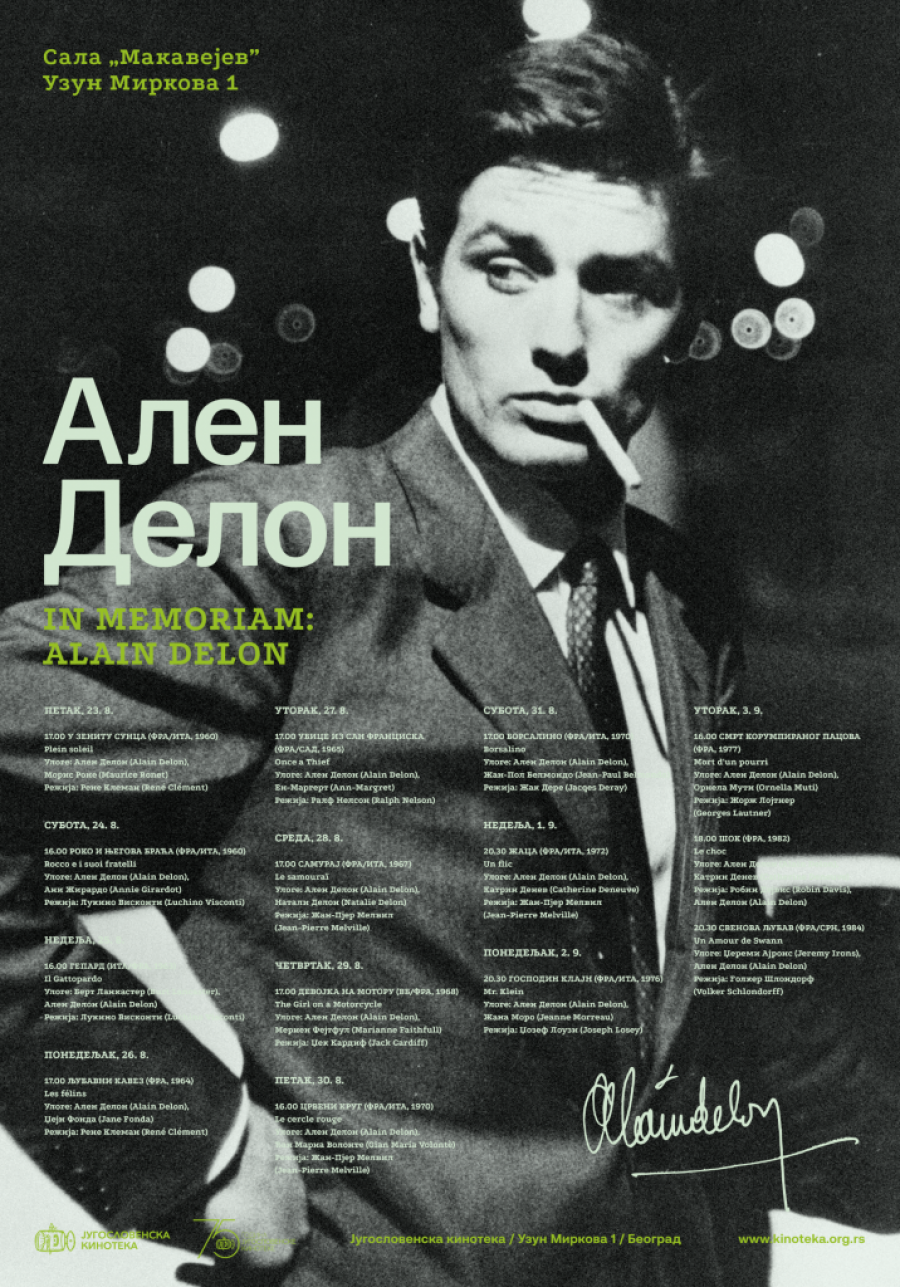 U Jugoslovenskoj kinoteci će od sutra, 23. avgusta do 3. septembra biti prikazan ciklus filmova posvećen Alenu Delonu, jednom od najvećih svetskih glumaca i ikoni francuskog filma, koji je preminuo 18. avgusta na svom imanju u Dišiju u Francuskoj, u 89. godini. Biće to prilika da se Beograđani i posetioci srpske prestonice podsete kultnih ostvarenja u kojima je Delon stavio trag.