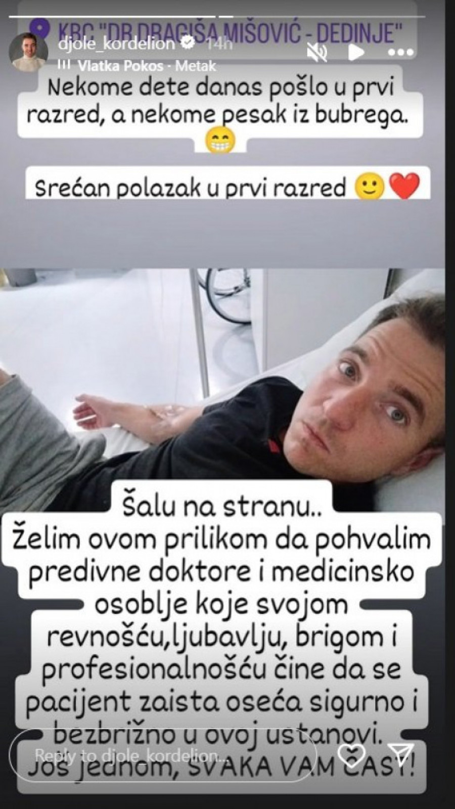 - Nekome dete danas pošlo u prvi razred, a nekome pesak iz bubrega. Srećan polazak u prvi razred. Šalu na stranu. Želim ovom prilikom da pohvalim predivne doktore i medicinsko osoblje koji svojom revnošću, ljubavlju, brigom i profesionalnošću čine da se pacijenti zaista osećaju sigurno i bezbrižno u ovoj ustanovi. Još jednom svaka vam čast - napisao je glumac.