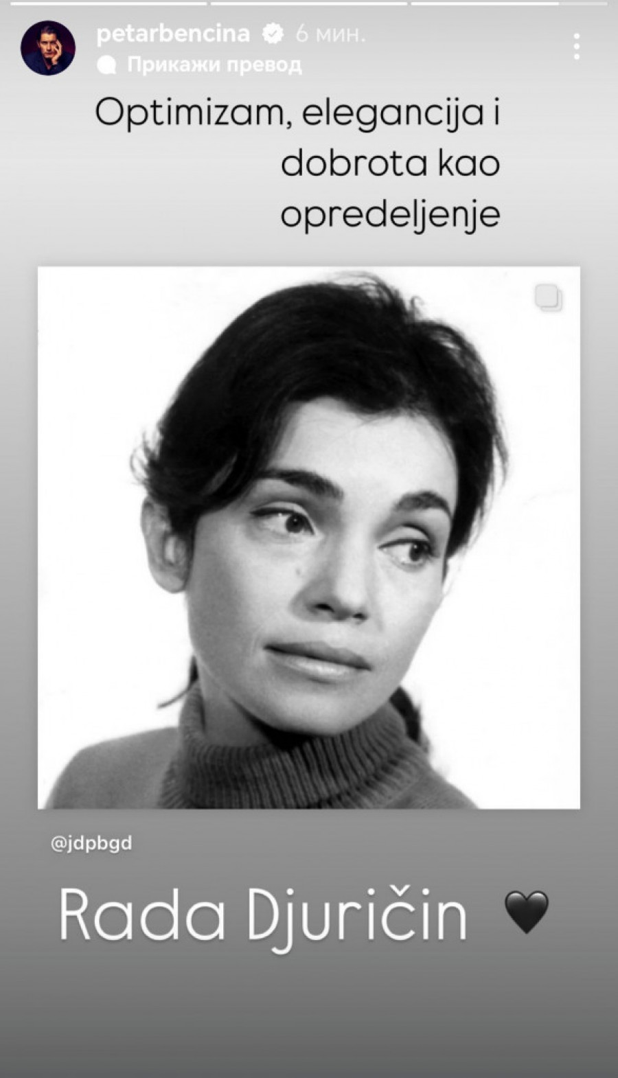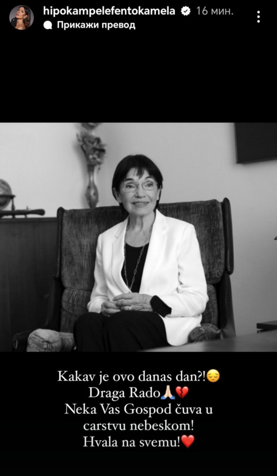 - Draga Rado, neka vas Gospod čuva u carstvu nebeskom! Hvala na svemu - napisala je Mićalovićeva na Instagramu uz crnobelu fotografiju Rade Đuričin.
