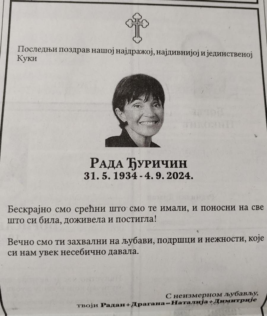 - Poslednji pozdrav našoj najdražoj, najdivnijoj i jedinstvenoj Kuki. Beskrajno smo srećni što smo te imali i ponosni na sve što si bila, doživela i postigla! Večno smo ti zahvalni na ljubavi, podršci i nežnosti, koje si nam uvek nesebično davala - navedeno je u čitulji koju je dao Radin sin Radan sa porodicom.