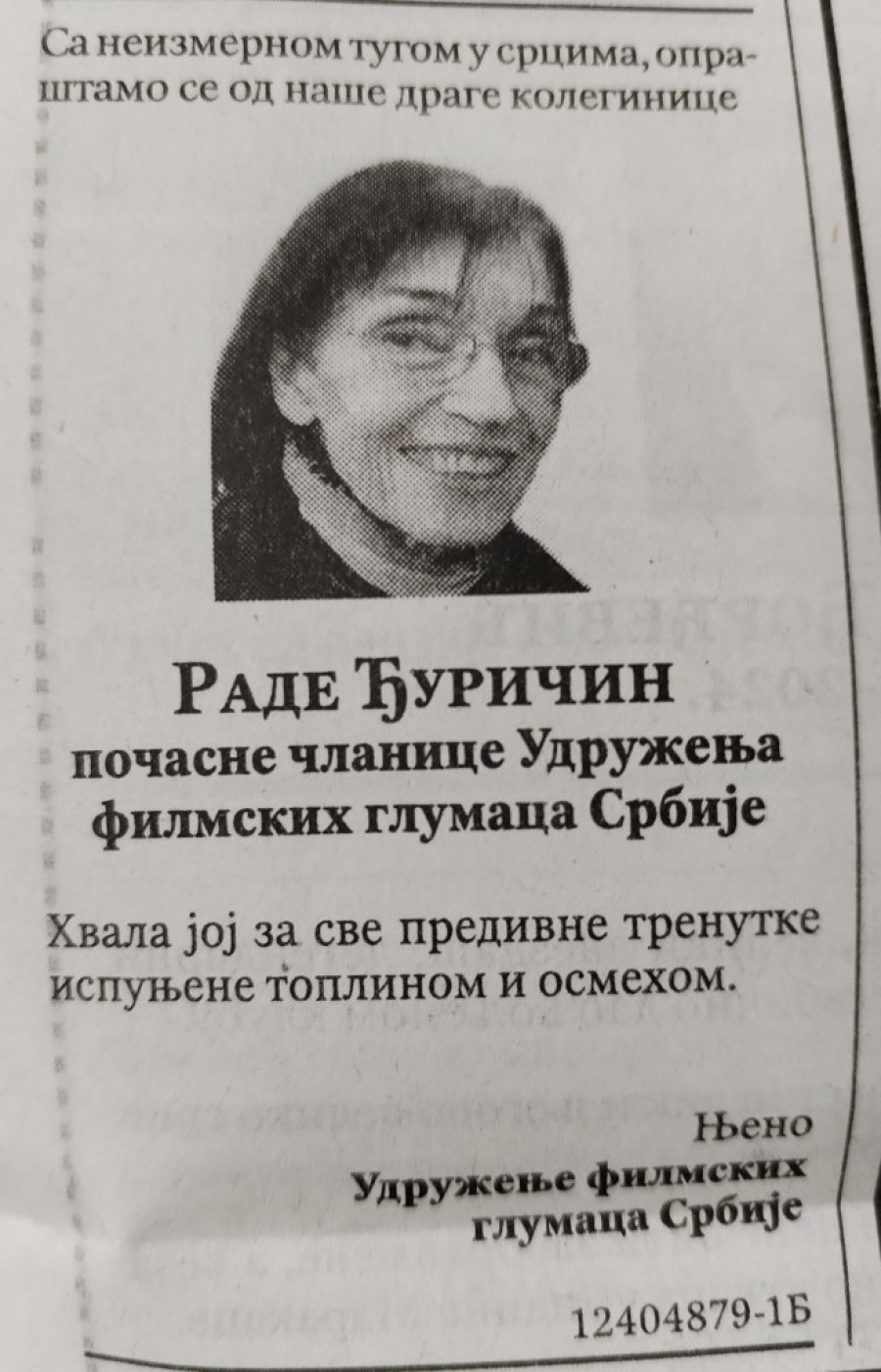 Čitulje posvećene Radi Đuričin, slavnoj glumici koja je preminula 4. septembra u 91. godini u Beogradu, osvanule su ovog jutra u srpskoj štampi. Potresnim porukama od velike glumice opraštaju se porodica i prijatelji, a među njima su Radin sin Radan sa porodicom, glumica Vjera Mujović, Udruženje filmskih glumaca Srbije, Jugoslovensko dramsko pozorište, Opera i teatar Madlenijanum, Dragan Đuričin...