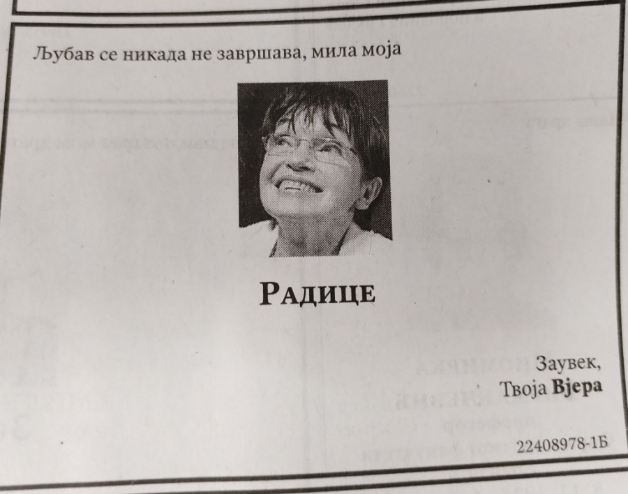 - Ljubav se nikada ne završava, mila moja Radice. Zauvek tvoja Vjera - potresne su reči kojima se glumica Vjera Mujović oprostila od drage koleginice i prijateljice.