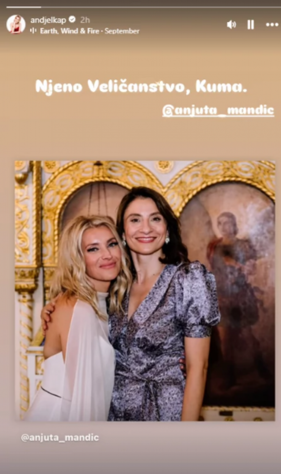 Podsećamo, kuma Anja Mandić je svoju objavu na društvenim mrežama popratila intrigantnom porukom: "Ovaj septembar je počeo veličanstveno. Nek tako i nastavi. Volim vas. Kumašin." Ova poruka je dodatno podgrejala znatiželju pratioca na društvenim mrežama, dok je Anđelka odgovorila: "Ti si uveličanstvenila i ovaj septembar i prethodni i život generalno. Nek se tako i nastavi. Volimo te. Kumašini."