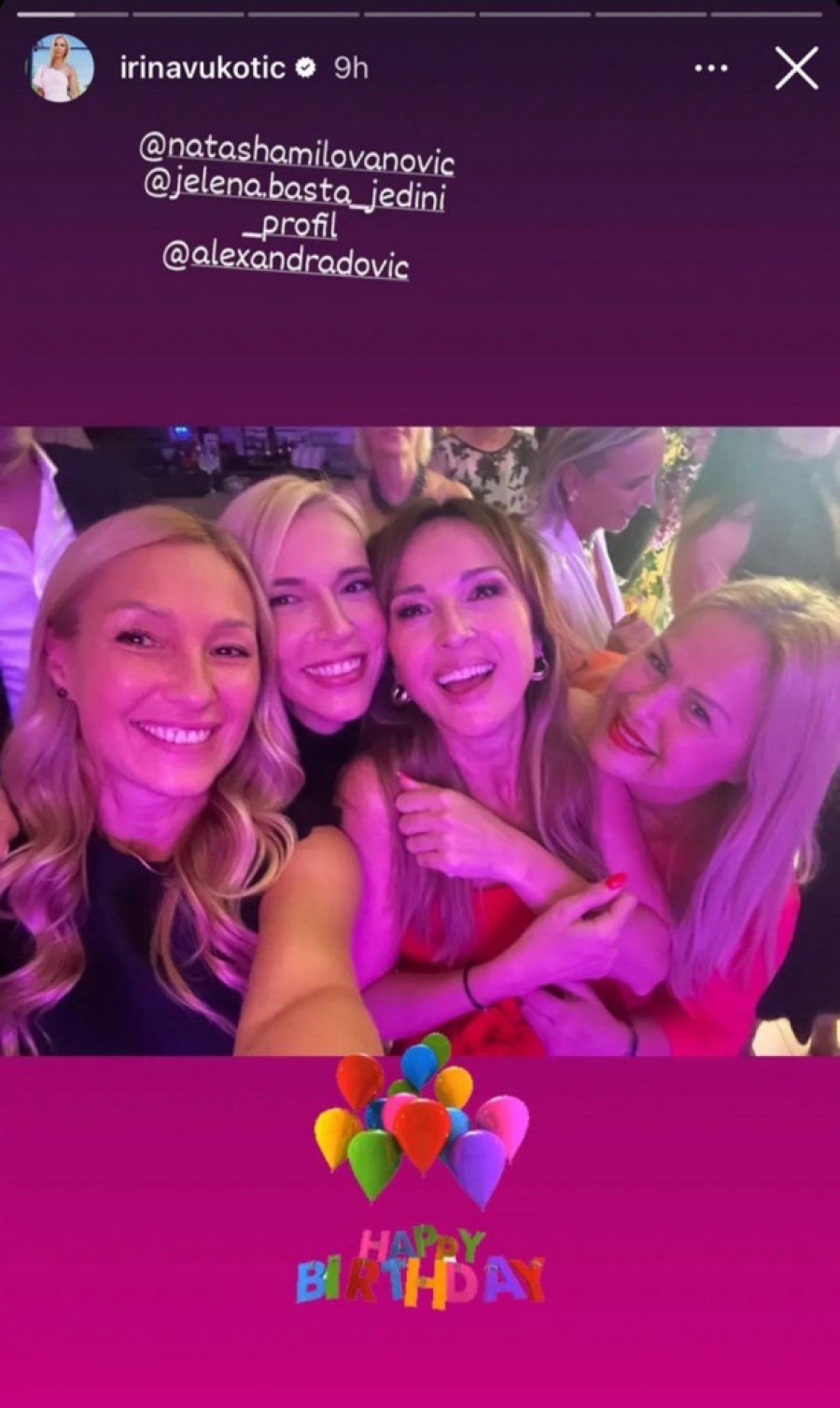 Ona se prvodila u društvu koleginice Irine Vukotić s kojom je ostala u dobrim odnosima. Tako je na Irininom profilu osvanuo i selfi posle dužeg vremenskog perioda, na kojoj su njih dve pozirale sa slavljenicom.