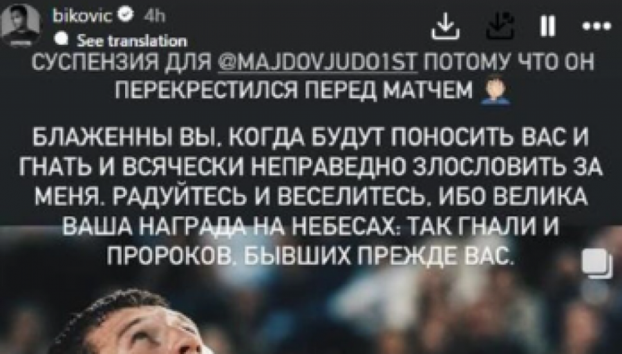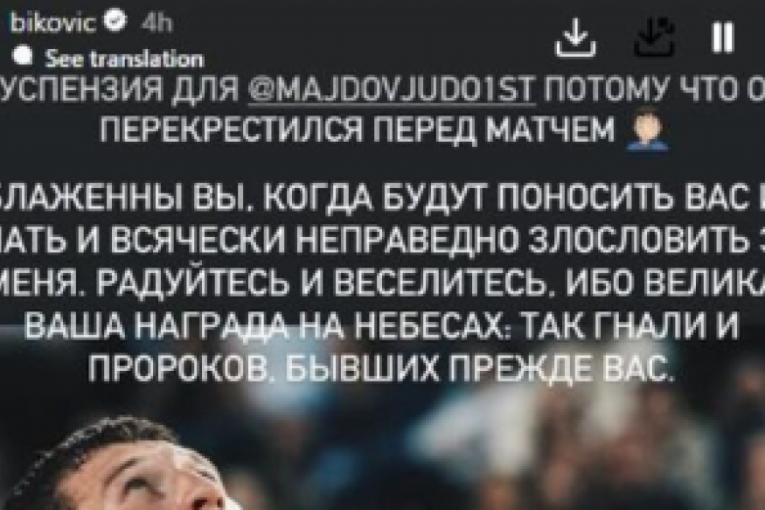 U svetlu ovih dešavanja, oglasio se i poznati srpski glumac Miloš Biković. Na svom Instagram profilu, koji prati oko 1.8 miliona ljudi, Biković je odlučio da javno pruži podršku Majdovu. On je na ruskom jeziku napisao snažnu poruku, u kojoj je istakao nezadovoljstvo zbog toga što je Nemanja Majdov suspendovan samo zbog toga što se prekrstio pre meča.