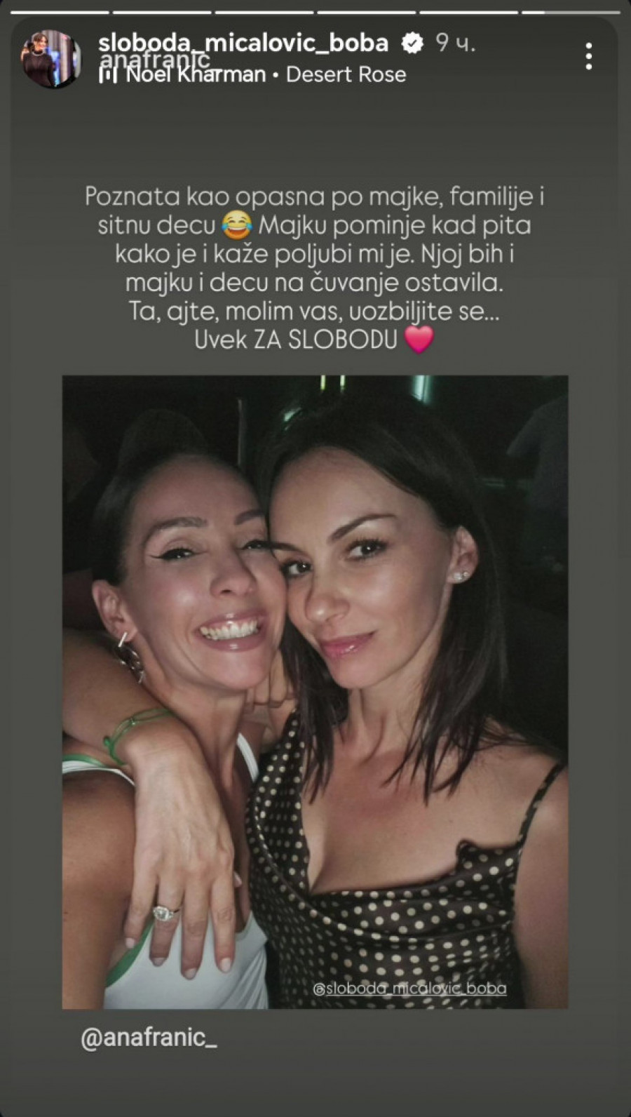 - Poznata kao opasna po majke, familije i sitnu decu. Majku pominje kad pita kako je i kaže poljubi mi je. Njoj bih i majku i decu na čuvanje ostavila. Ta, 'ajte, molim vas, uozbiljite se... - napisala je Ana i na kraju poentirala: