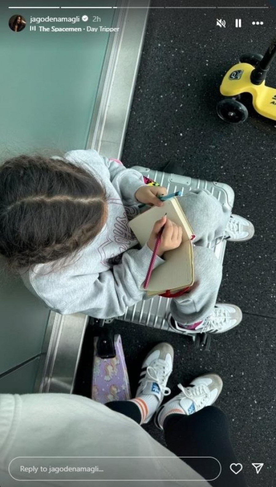 Pred poletanje aviona Jelisaveta je fotografisala ćerku dok je sedela i crtala u svojoj svesci, a svima je zapalo za oko to što je glumica u potpuno ležernom izdanju - širokom duksu, helankama i patikama.