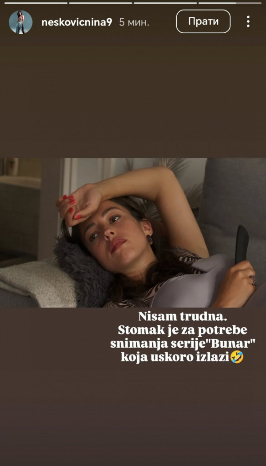 Poznata glumica Nina Nešković, koja je u srećnoj vezi s kolegom Petrom Strugarom, objavila je na društvenim mrežama svoju fotografiju u uskoj kratkoj haljini ispod koje se jasno ocrtava trudnički stomak. Odmah nakon ove usledila je nova Ninina objava na Instagramu u kojoj otkriva šta se krije iza njene fotografije sa stomakom do zuba.