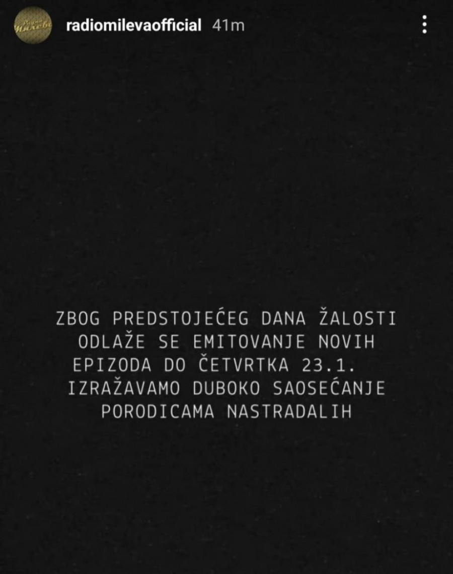 - Zbog predstojećeg Dana žalosti odlaže se emitovanje novih epizoda do četvrtka 23. januara. Izražavamo duboko saosećanje sa porodicama nastradalih - navodi se u objavi na Instagram stranici serije.