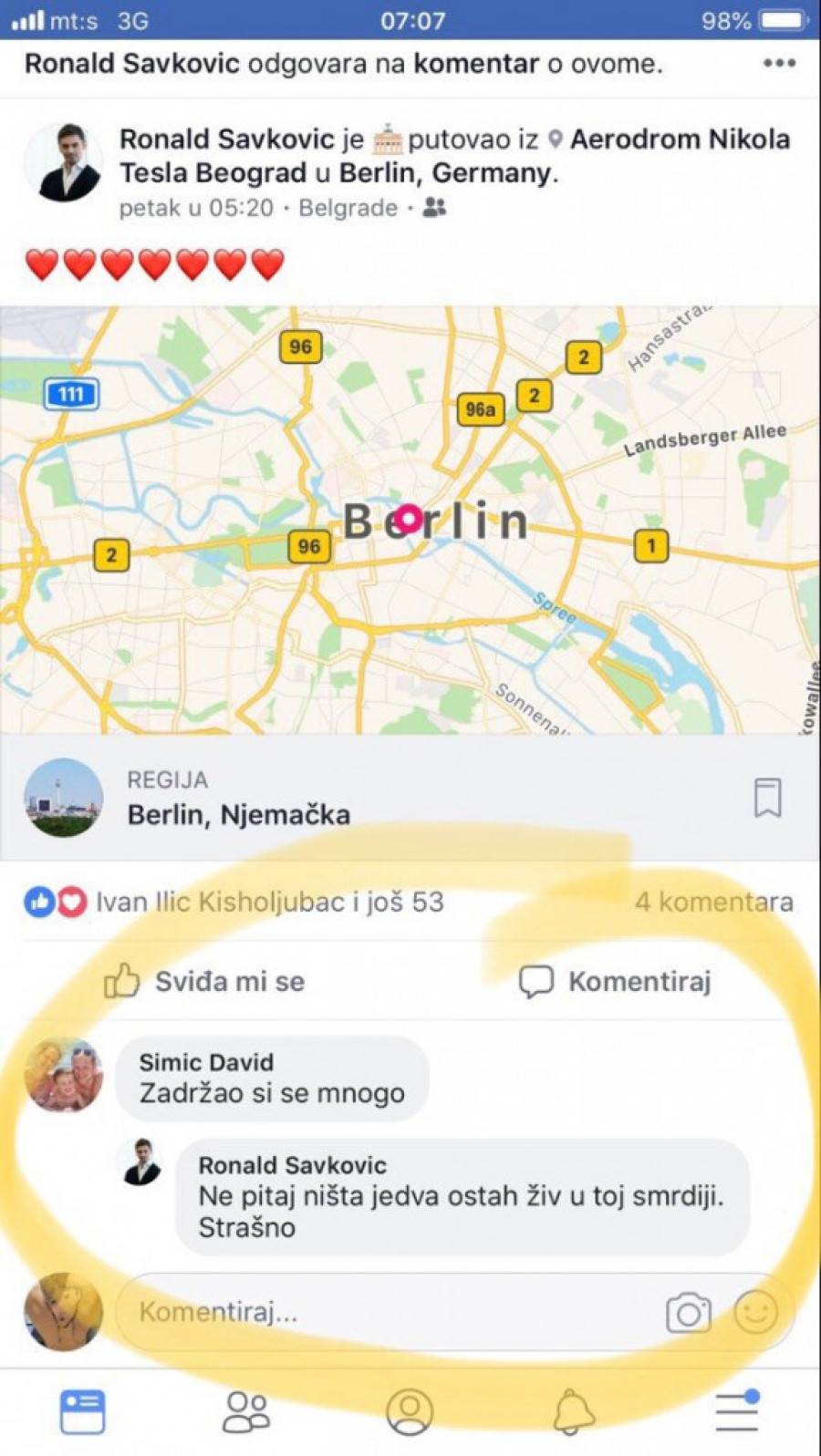 Zloban komentar je ostavio na društvenoj mreži, a ispod objave da stiže u Berlin.