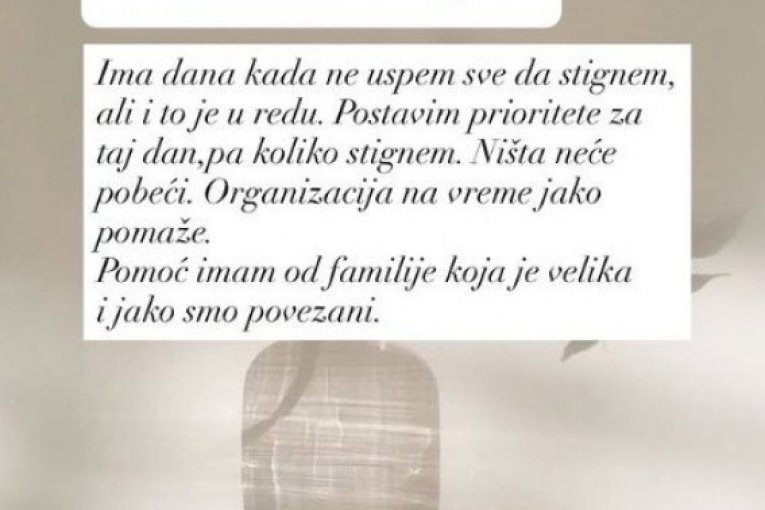 - Ima dana kada ne uspem sve da stignem, ali to je u redu. Postavim prioritete za taj dan, pa koliko stignem. Ništa neće pobeći. Organizacija na vreme jako pomaže. Pomoć imam od familije koja je velika i jako smo povezani - otkrila je Mirka.