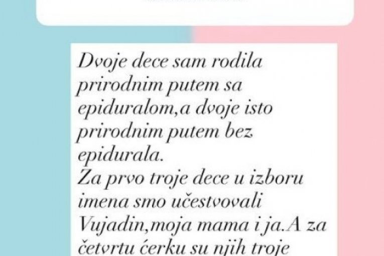 - Dvoje dece sam rodila prirodnim putem sa epiduralom, a dvoje isto prirodnim putem, samo bez epidurala. Za prvo troje dece u izboru imena smo učestvovali Vujadin, moja mama i ja. A za četvrtu ćerku su njih troje izabrali ime - navela je Vasiljevićeva na svojoj društvenoj mreži.