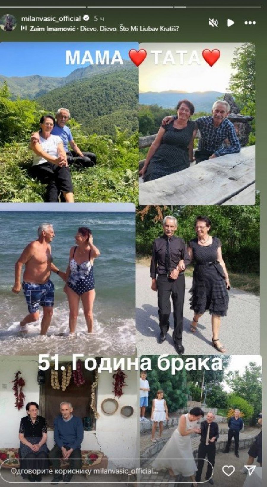 Srpski glumac Milan Vasić, poreklom iz Kosovske Kamenice, nedavno je izazvao brojne reakcije svojih pratilaca na društvenim mrežama. Povod za to je bio poseban trenutak u njegovom porodičnom životu – proslava zlatne godišnjice braka njegovih roditelja. Njegovi roditelji slave punih 51 godinu zajedničkog života, što je zaista impresivan jubilej koji zaslužuje svaku čestitku i pohvalu. Milan je na svom Instagram profilu podelio neviđene privatne fotografije roditelja, uz emotivan komentar: