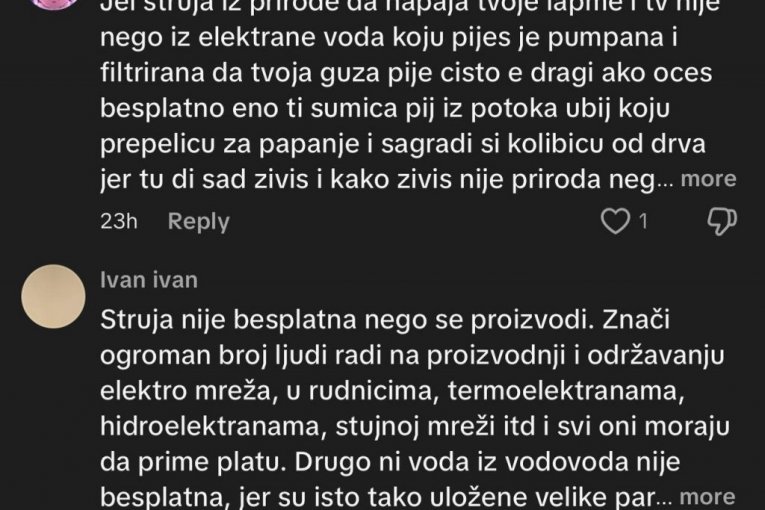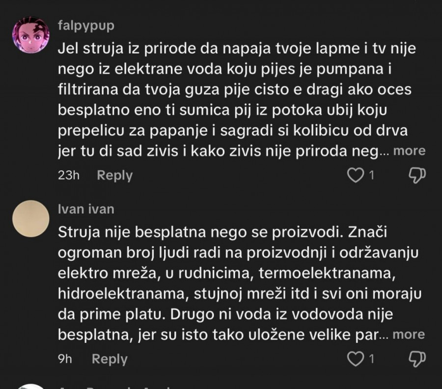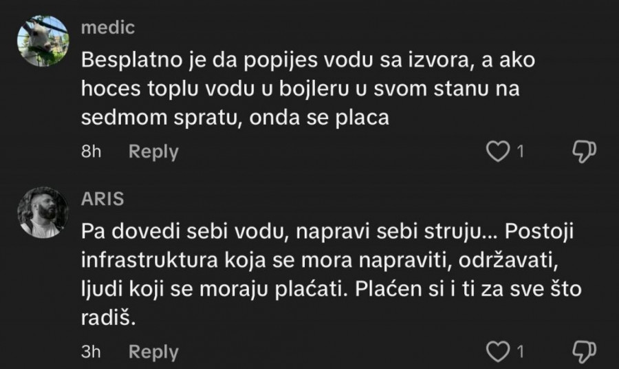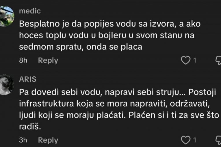 – Zašto ja, koji sam rođen na ovoj planeti, moram da plaćam da bih na njoj živeo? Voda dolazi iz prirode, struju je napravio čovek. Ne razumem zašto se to plaća kao da nam neko daje nešto što nije već naše - istakao je Miloševć.