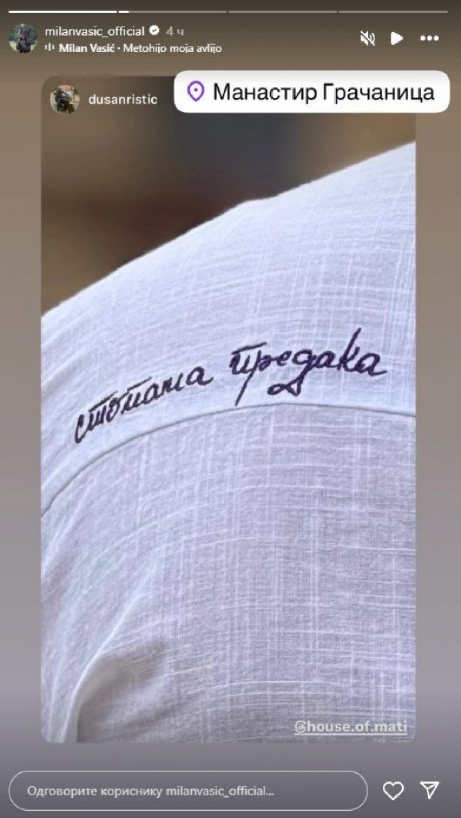 Ovim stihovima Vasić je dočarao koliko mu ovaj trenutak znači — ne samo kao ocu, već i kao čoveku koji duboko poštuje tradiciju i svoje korene. Posebnu pažnju privukao je i njegov stajling za ovu priliku — Milan je nosio košulju sa izvezenim rečima "Stopama predaka“, čime je jasno poručio da želi da nastavi porodični put i da svog sina odgaja u duhu vere i običaja.