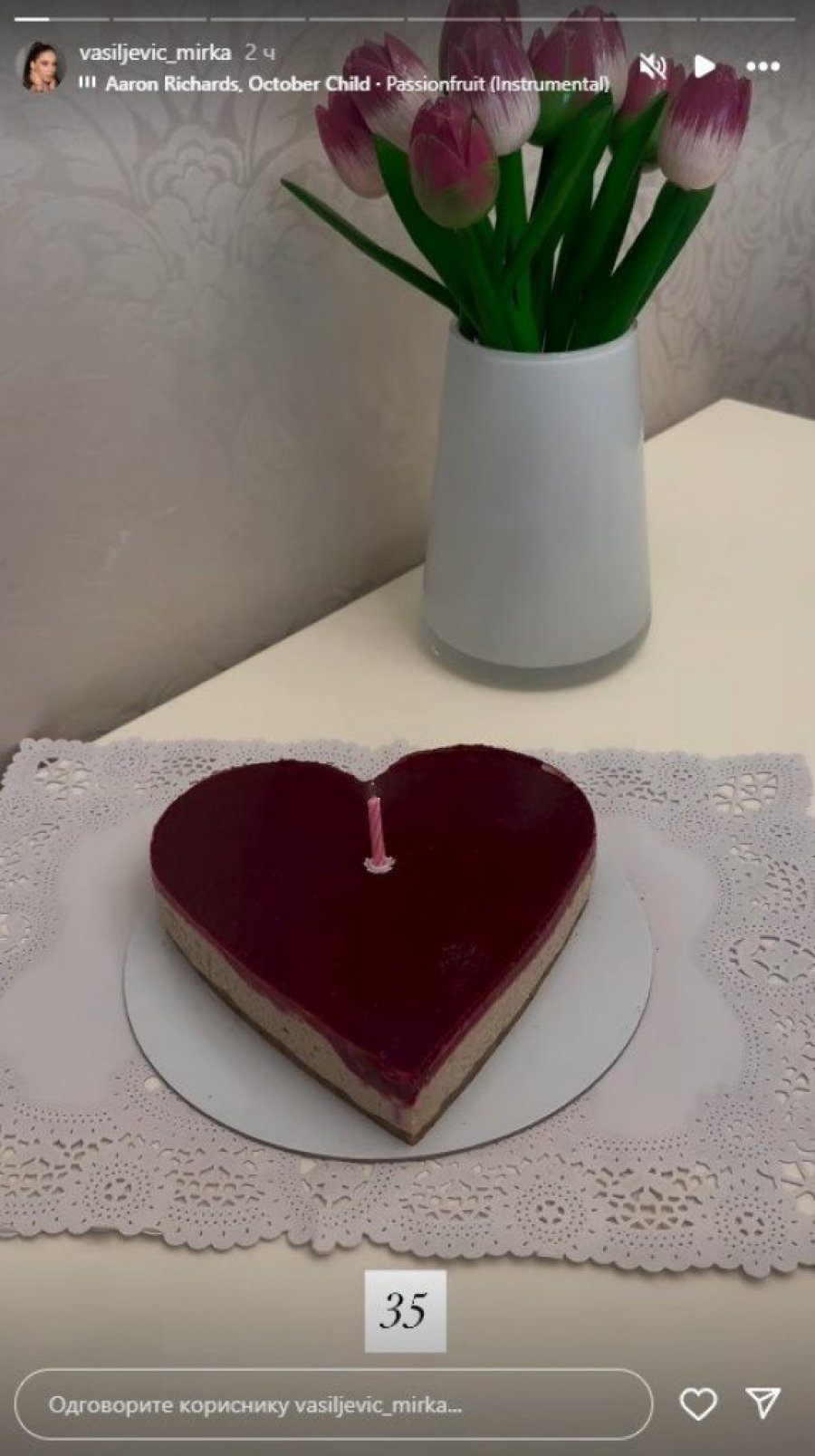 Glumica Mirka Vasiljević danas proslavlja rođendan, a na svom Instagramu podelila je delić atmosfere. Mirka se ove godine odlučila za tortu sa šumskim voćem u obliku srca, a u sredini se nalazila samo jedna svećica. Glumica je pokazala i buket lala koji je stavila u belu vazu. - 35 - kratko je napisala u opisu, a mnogi su ostali u čudu jer su mislili da je znatno mlađa.