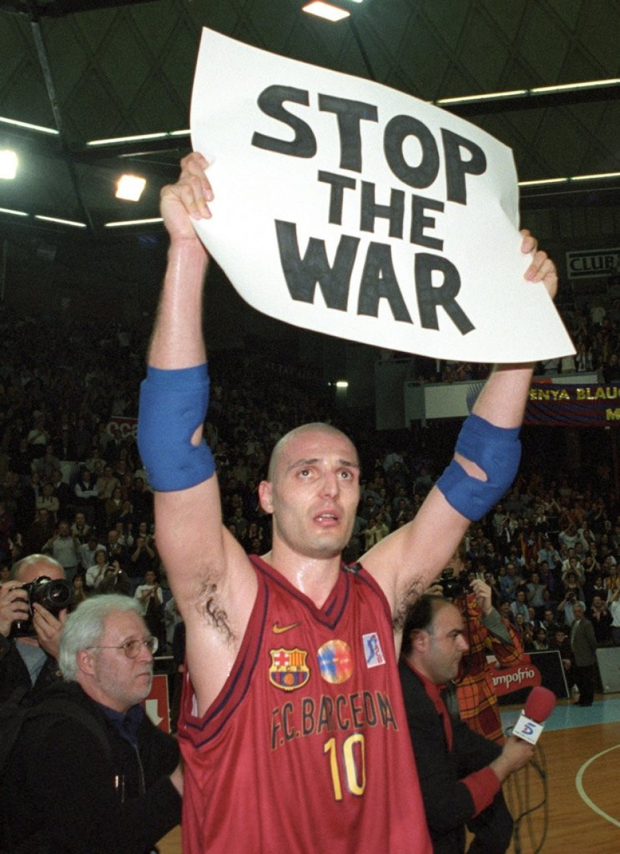 Mi, srpski igrači u Španiji, tog proleća u znak protesta igrali smo bez prezimena na dresovima, a španski klubovi su nas podržavali u tome. Uoči revanša finala Kupa Koraća, posle ubedljivog poraza od Estudijantesa u Madridu (93:77), iz kluba su mi rekli da ću dobiti specijalnu nagradu ukoliko Barselona osvoji trofej. Kad smo to uspeli (97:70), dali su mi transparent "Stop The War" (Zaustavite rat) koji sam na parketu podigao visoko iznad glave. U istoj toj dvorani sledeće godine sam sa Realom osvojio titulu prvaka Španije, posle pobede u majstorici.“
