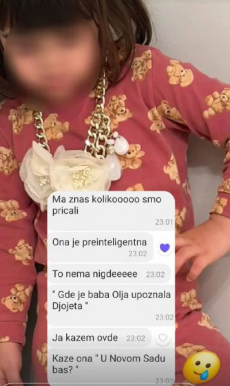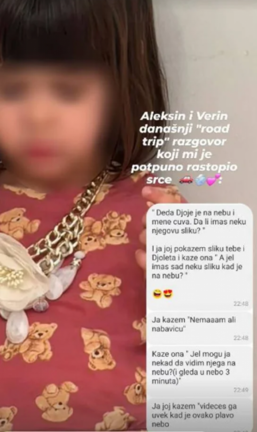 U prepisci koju je Olivera objavila, uz komentar da joj je ovaj razgovor "potpuno rastopio srce", Aleksa je detaljno preneo razgovor s ćerkom. Vera je prvo želela da vidi fotografiju svog deke. Nakon što joj je tata pokazao slike na kojima su ona i Đole, devojčica je pitala da li postoji neka njegova slika sada kada je na nebu.