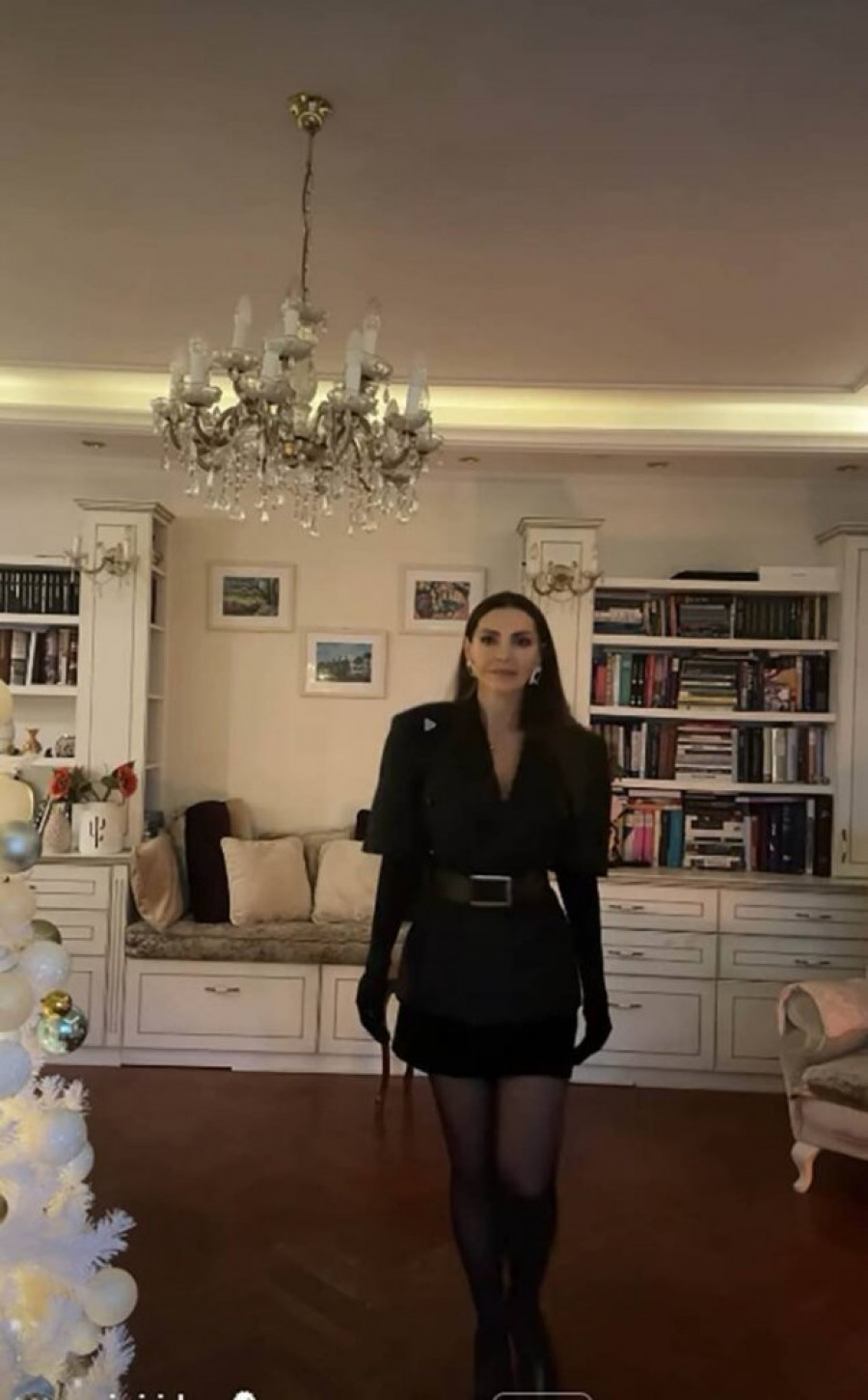 Posebno se istakao veliki kristalni luster koji dominira prostorijom i koji je mnogima zapao za oko, kao i elegantne police sa knjigama koje dodatno daju utisak sofisticiranosti i uređenog porodičnog ambijenta. Nameštaj u svetlim tonovima dodatno doprinosi osećaju prostranosti i harmonije u domu.