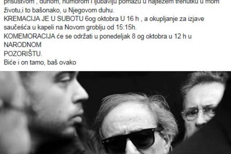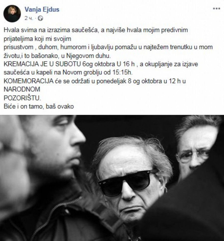 Foto: facebook.com/printscreen"Hvala svima na izrazima saučešća, a najviše hvala mojim predivnim prijateljima, koji mi svojim prisustvom, duhom, humorom i ljubavlju pomažu u najtežem trenutku u mom životu, i to baš onako, u njegovom duhu. Kremacija je u subotu, 6. oktobra u 16 sati, a okupljanje za izjave saučešća u kapeli na Novom groblju od 15.15. Komemoracija će se održati u ponedeljak 8. oktobra u 12 sati u Narodnom pozorištu. Biće i on tamo, baš ovako", naslednica Predraga Ejdusa glumica Vanja Ejdus objavila je potresnu poruku juče na društvenoj mreži.
