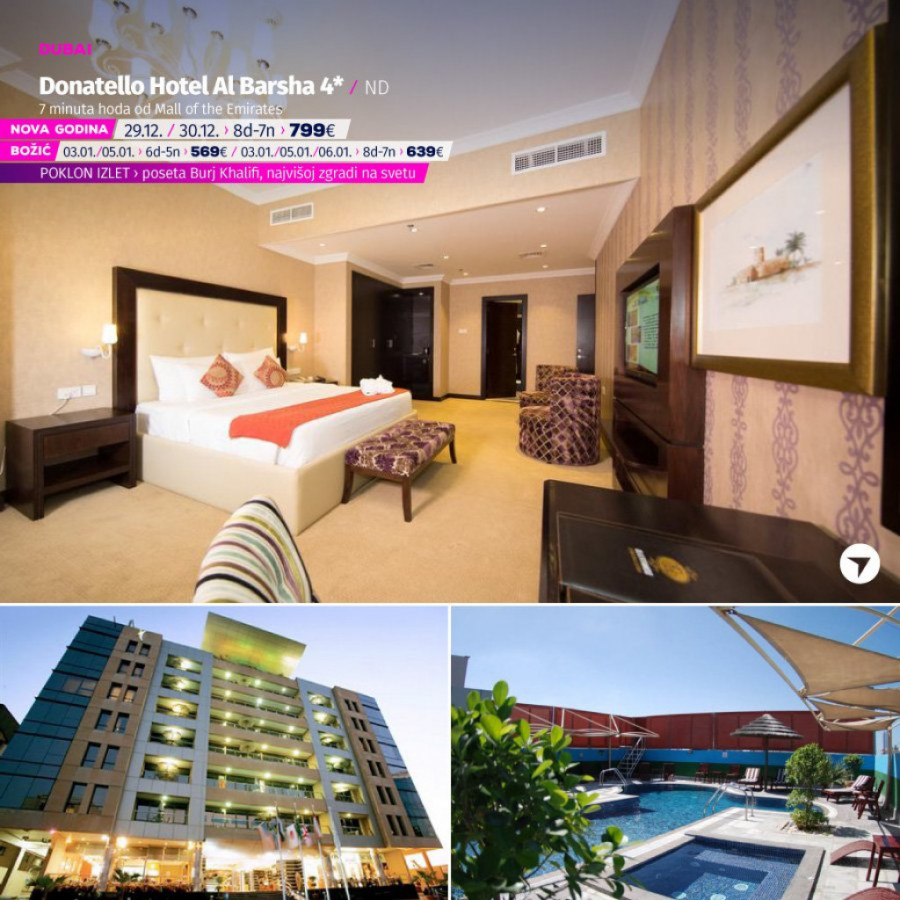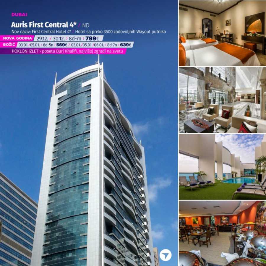 Ukoliko imate dilemu u odabiru hotela, preporuka naše agencije su hoteli: Auris First central, najprodavaniji hotel sa preko 3.500 zadovoljnih putnika, Canal Central Business Bay, nedaleko od Dubai Mall-a, sa pogledom na toranj Burj Khalifa, Biblos Marina Hotel u luksuznom delu grada Jumeirah Beach Residens i Dubai Marina, na 5 minuta hoda od najpoznatije plaže Jumeirah Beach, Donatello za kupoholičare u blizini Mall Of the Emirates i Habtoor Grand beach Resort na Jumeirah plaži.