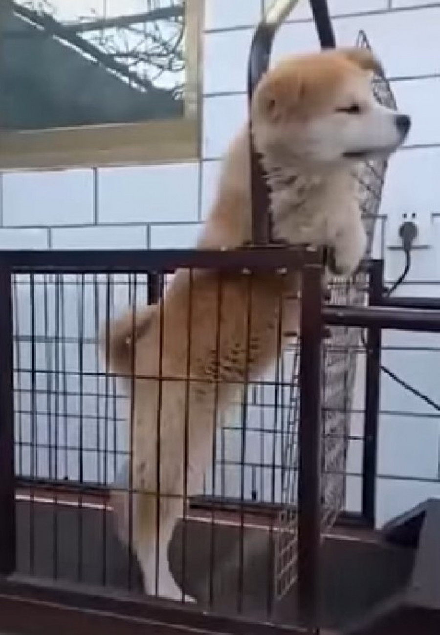 Dok nije smislio kako će se izvući, Žuti je prvo poslušno hodao po traci. Ali, samo nekoliko trenutaka kasnije otišao je u ćošak, popeo se prednjim šapama na ogradu te samo jednu zadnju šapu pomicao na traci.
