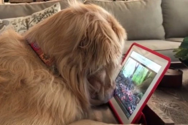 Zaljubljeni pas je držao uređaj prednjim šapama i pratio šta na videu radi njegova voljena veverica. Sve vreme je gledao u nju kao hipnotisan i nije bio u stanju da odvoji pogled sa ekrana.