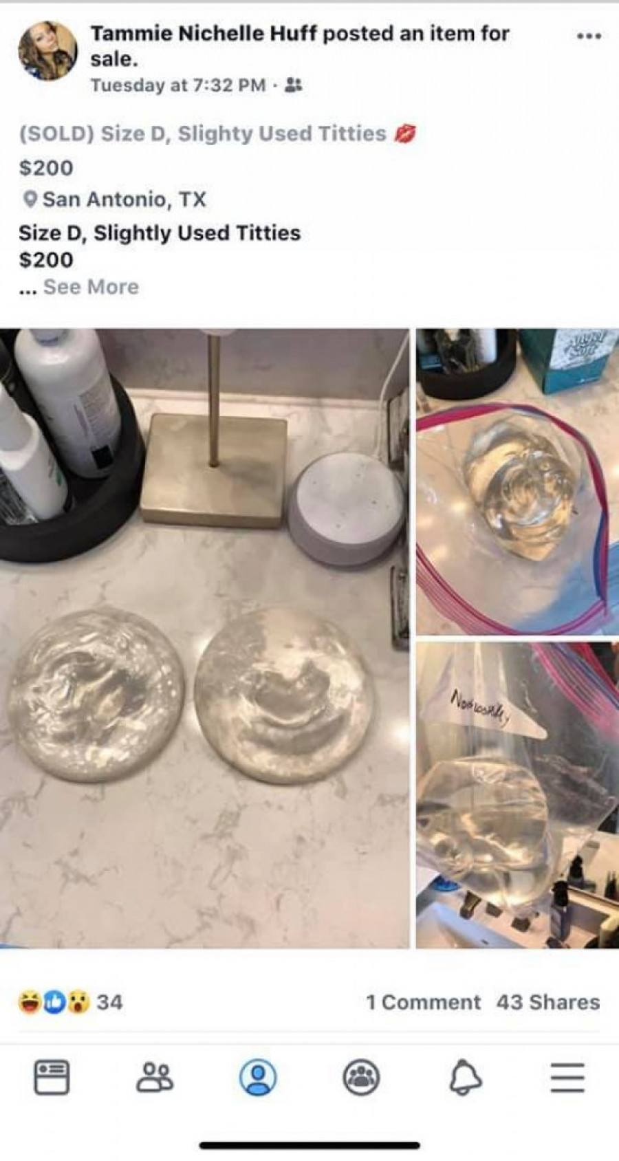 Foto: facebook.com/Tammie Nichelle HuffTami Nišel Haf iz San Antonija u Teksasu rekla je da su njeni implanti "malo prešli" i postavila oglas za prodaju na mestu za oglašavanje ove društvene mreže.
