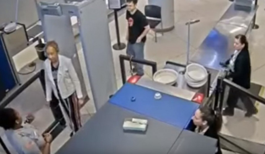 Na snimku sa međunarodnog aerodroma "Grejter Ročester" vidi se kako radnica obezbeđenja daje Strasneru poruku, nakon što je on prošao kroz detektor metala.