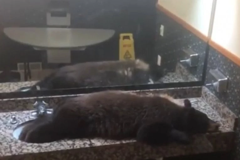 Gosti i osoblje hotela u Montani u SAD ostali su u šoku kada su otkrili ko se skriva u ženskom toaletu. Naime, na umivaonicima je ležao mladi medved koji je izgledao kao da je zadivljen prostorijom u kojoj se nalazi.