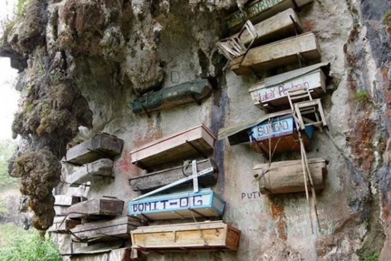 Čak ni to nije "najluđa stvar" koju ovaj narod čini. Ti kovčezi se ne zakopavaju u zemlju, što nije tolika retkost, ima mnogo naroda koji ne žele da prljaju zemlju, ali postoji li još negde običaj da kovčezi vise s litice ili unutar pećina?
