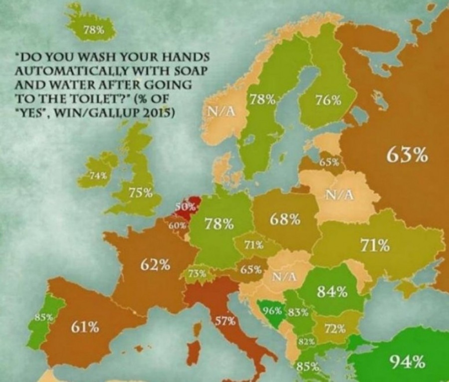 Koliko često peremo ruke nakon upotrebe toaleta? Mapa Evrope koja će vas iznenaditi