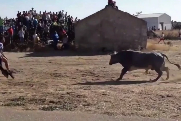 U klipu je prikazano kako mladić (33) u sivoj majici izaziva bika da ga juri, nakon čega životinja besno kreće za njim, a u tom trenutku ga drugi momak preskače, ali bik sustiže prvog i počinje da ga probada rogovima.
