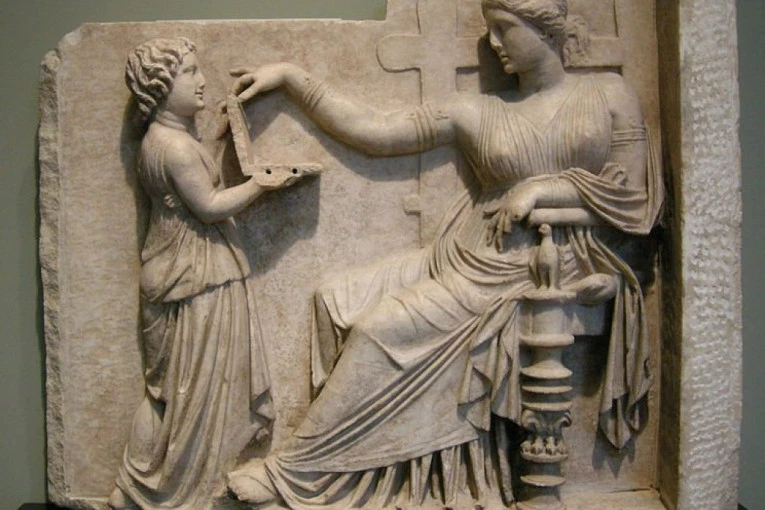 Foto: Wikimedia CommonsKamena ploča prikazuje ženu kako sedi na stolici, ispred nje manji ženski lik ili devojčicu koja u rukama drži predmet koji podseća na laptom.