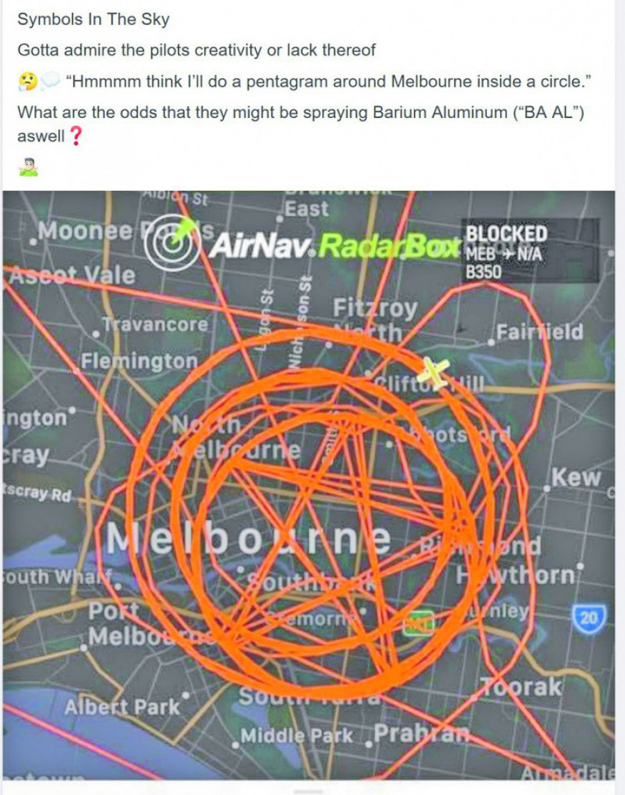 Društvene mreže u Australiji preplavljene su snimkom sa kompjuterskog servisa za praćenje putanja letova aviona ernav rajdarboks, koji navodno pokazuje kako je letelica iznad Melburna imala putanju koja odgovora satanističkom pentagramu ucrtanom u krug.