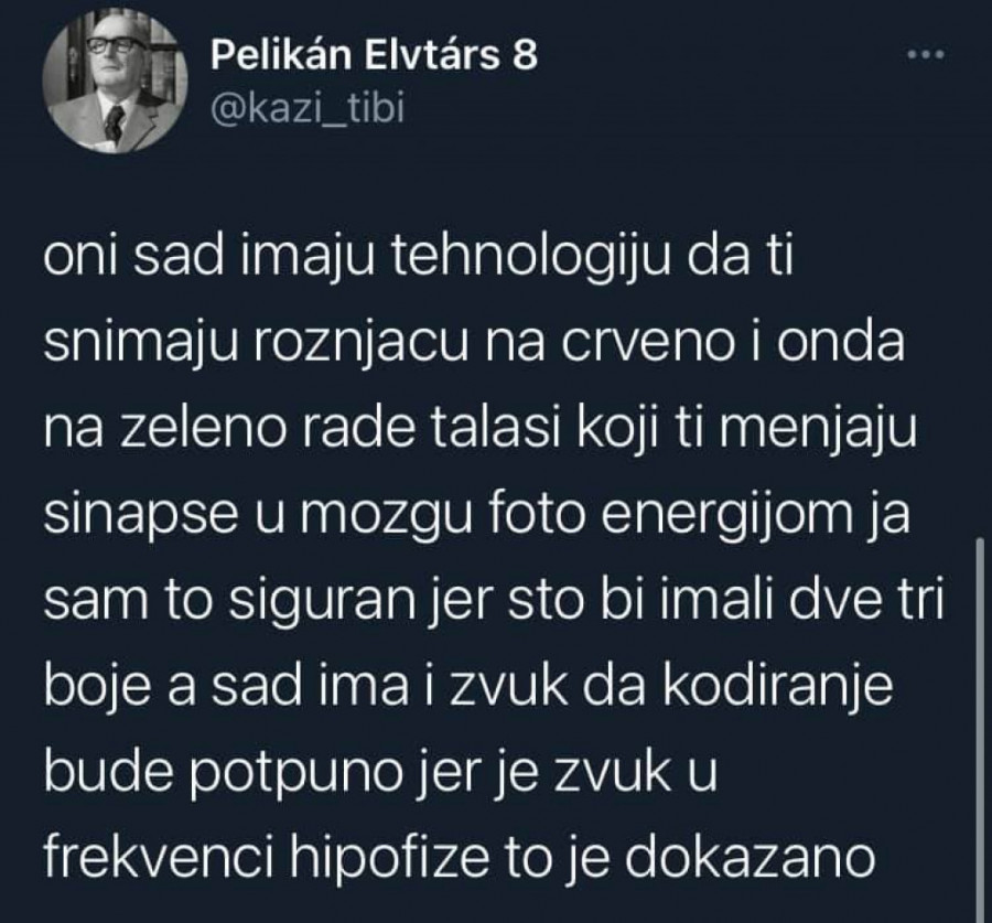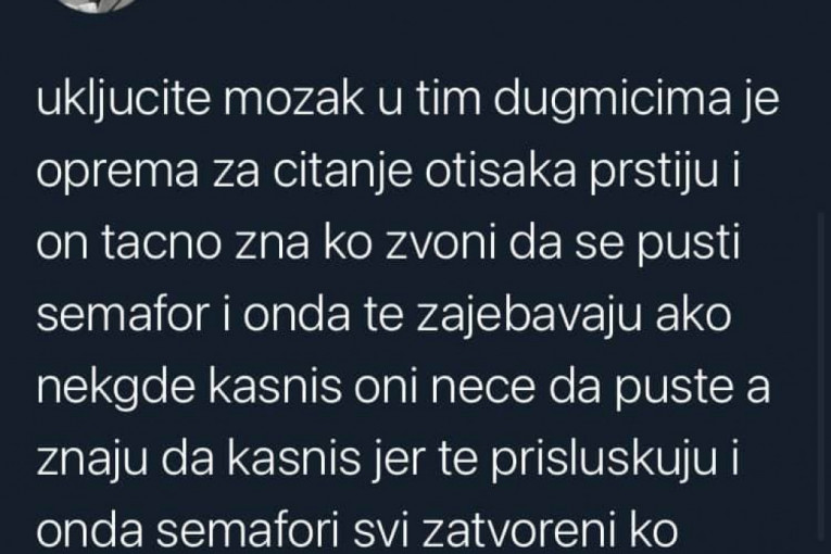 Tviteraš dodaje da se "u tim dugmićima nalazi oprema za čitanje otisaka prstiju kako bi semafor tačno znao ko zvoni kako bi ga za*ebavali, odnosno držali crveno svetlo ako ta osoba negde kasni", dok svetla "menjaju sinapse u mozgu foto energijom". On takođe kaže da su semafori potpuno nepotrebni jer "svako vidi kad idu kola".