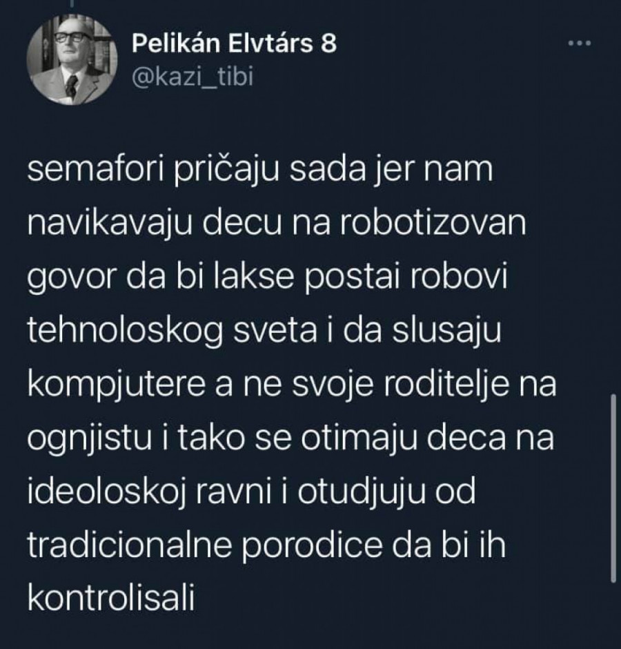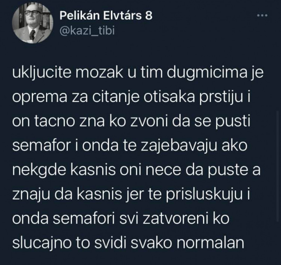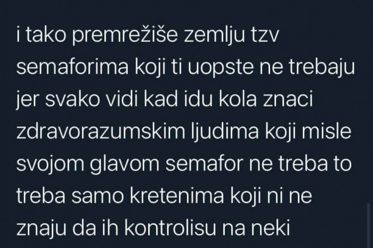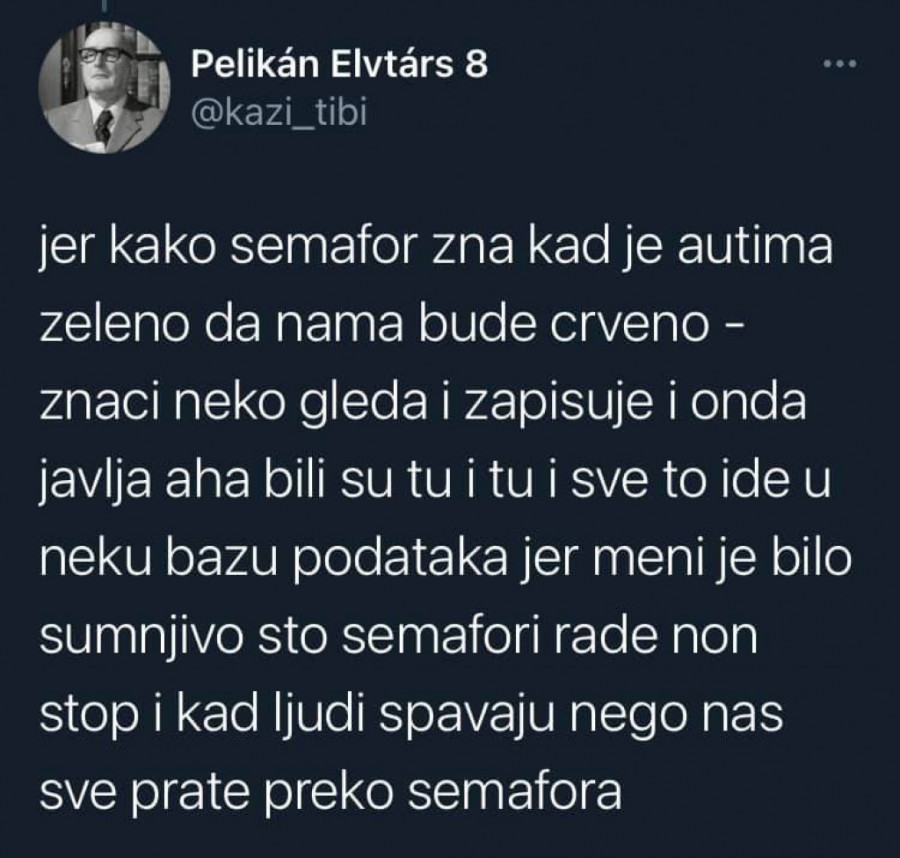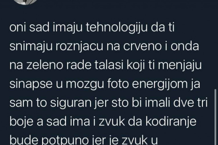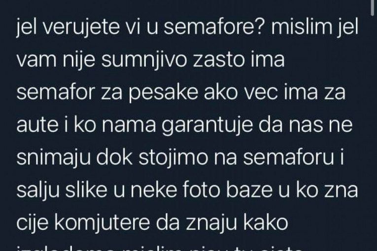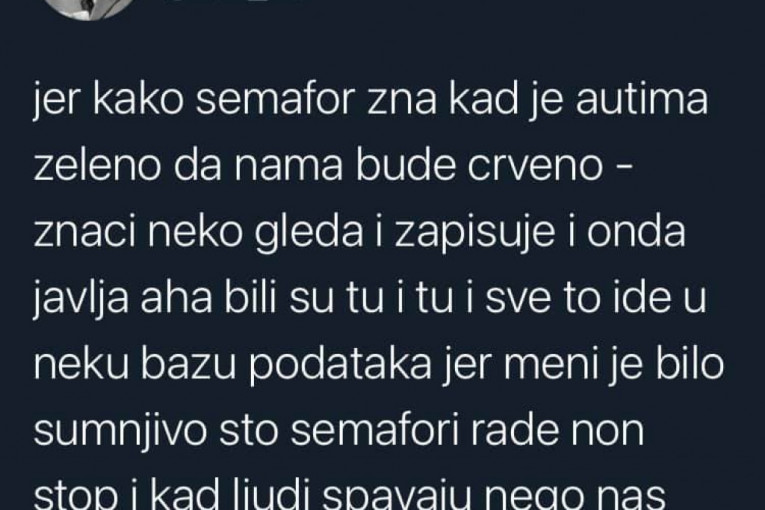 - Znači neko gleda i zapisuje i onda javlja "aha, bili su tu i tu" i sve to ide u neku bazu podataka jer meni je bilo sumnjivo što semafori rade non stop i kad ljudi spavaju - navodi on i dodaje da "nas sve prate preko semafora".