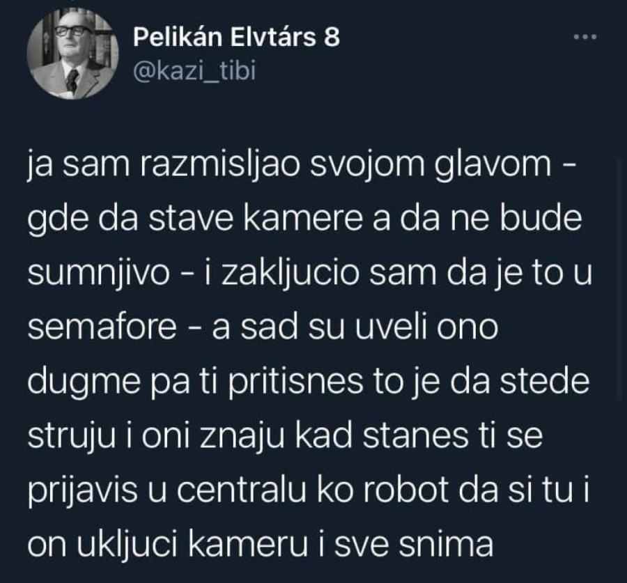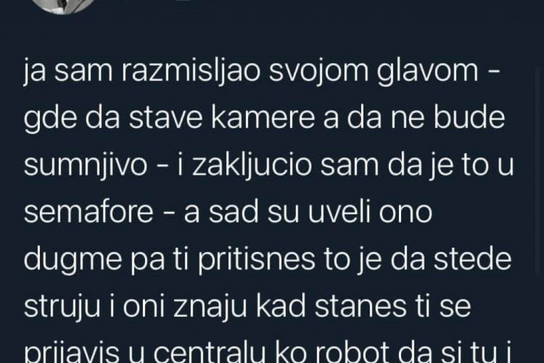 Dalje zaključuje da "su kamere postavljene u semafore kako ne bi bilo sumnjivo", a da je sada, kako kaže, uvedeno dugme na njima kako bi se štedela struja.