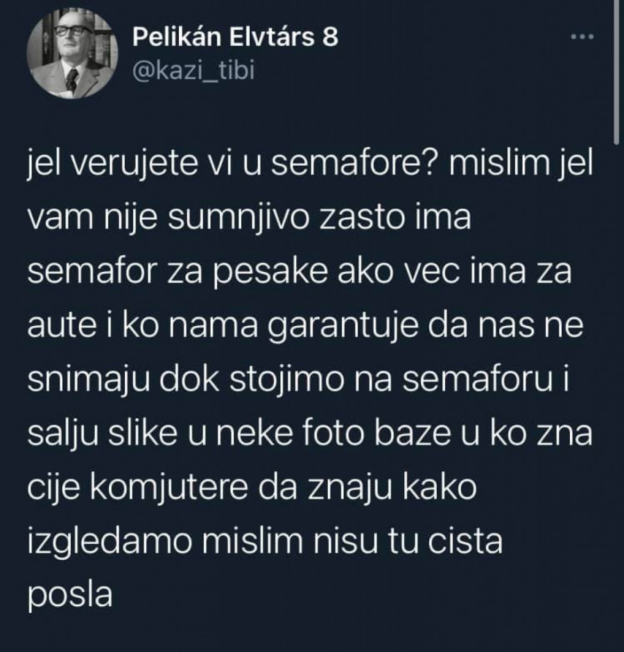 - Je l' vam nije sumnjivo što postoji semafor za pešake kad već ima i za automobile. Ko nama garantuje da nas ne snimaju dok stojimo na semaforu i šalju slike u neke foto baze, u ko zna čije kompjutere da znaju kako izgledamo. Nisu tu čista posla - počinje on svoju analizu.