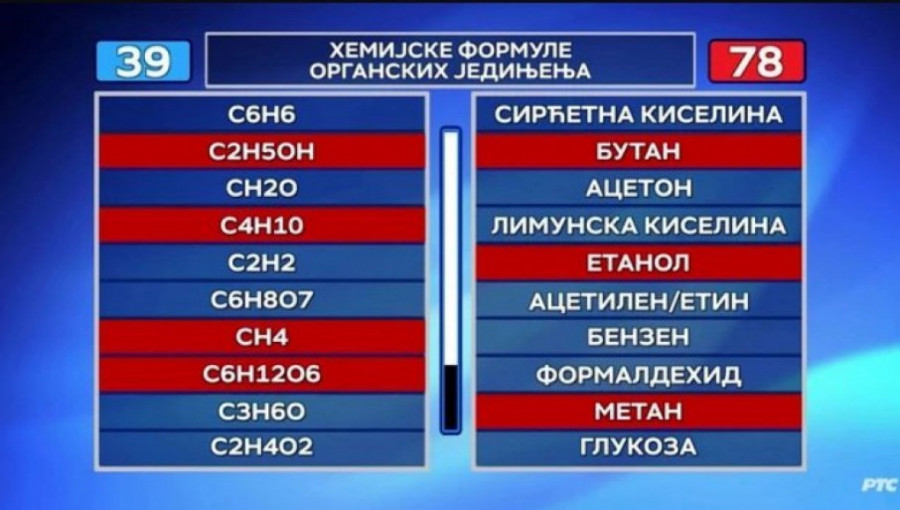 Tokom igre "Spojnice" crveni takmičar je dobio zadatak da spoji hemijske formule organskih jedinjenja među kojima je morao da nađe kako se hemijskom formulom piše butan, aceton, glukoza, formaldehid i slično... Takmičar je uspeo da nađe četiri od mogućih 10 odgovora, dok je njegov protivnik uspeo da spoji dva rešenja.