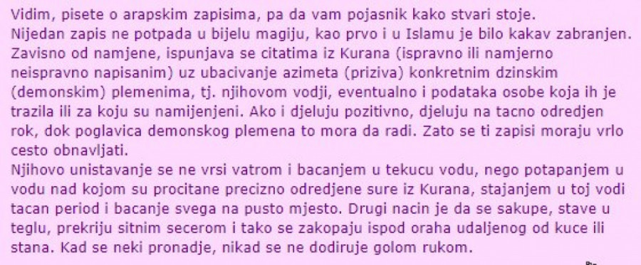 Druga žena je dodala: "Ja sam čula da može da se radi i dobar i loš taj zapis. Ne znam puno o tome jer ne verujem u to, ali neko iz moje porodice je nalazio to po kući i tvrdio da je tada imao probleme u braku. Ono što znam ja tj. što mi je ispričano je da je bio trouglastog oblika (malen),a unutra nekoliko još manjih tih papirića sa još zapisa, šta je pisalo pojma nemam,ali valjda ništa dobro... Uglavnom ih je nalazila na mestma poput: iza kuhinjskog elementa, iza prekidača, zvona (tj onog prekidača za zvono napolju) i sl.