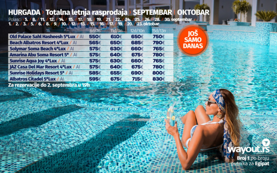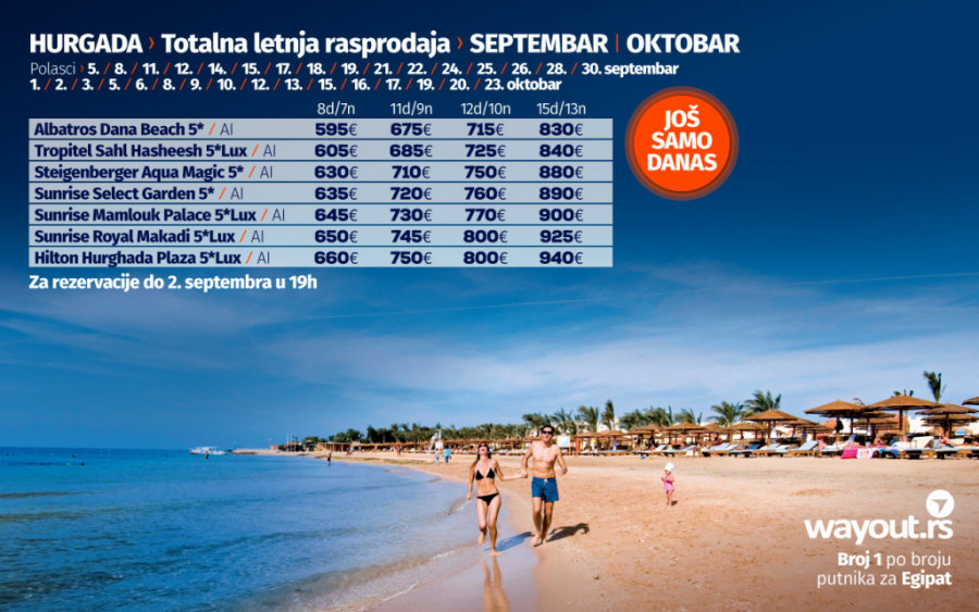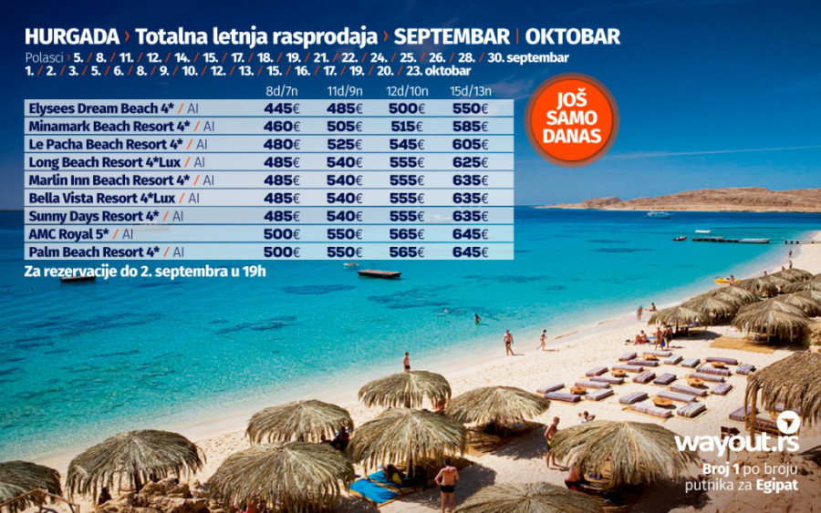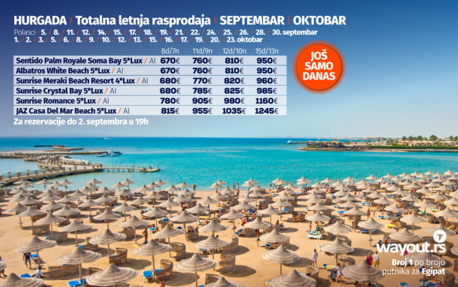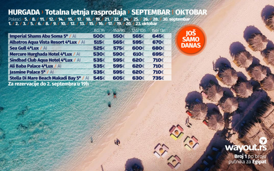 Pošto leto u Hurgadi traje tokom cele godine, za sve putnike smo spremili vrelu letnju rasprodaju za najsigurnije jesenje putovanje, a koja obuhvata totalnu rasprodaju za polaske u septembru i oktobru, kao i Ultra First Minute ponudu za polaske u novembru i decembru, sa najpovoljnijim cenama aranžmana do sada i sa najvećim izborom hotela na tržištu. Obzirom na to da će Hurgada i u narednim mesecima biti jedna od glavnih svetskih turističkih destinacija, svima preporučujemo da se što pre odluče za željeni termin i željeni hotel, kako bi svoj aranžman bukirali pre putnika iz ostalih evropskih zemalja kao što su Nemačka, Rumunija, Češka, Poljska, Ukrajina, Rusija, a sve to za samo 199eur po rezervaciji, dok je ostatak aranzmana potrebno isplatiti 15 dana pre putovanja...