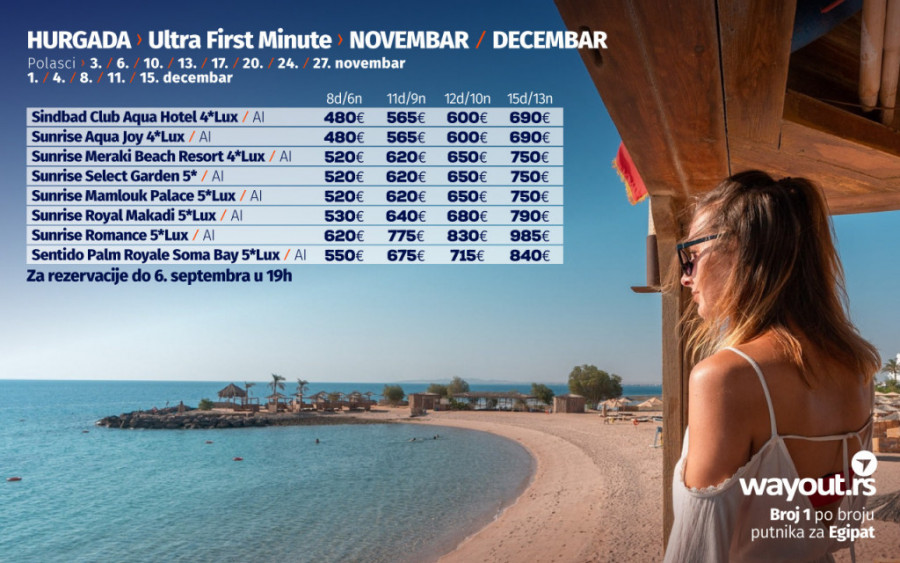 Jedan od pokazatelja da je Hurgada jedna od najsigurnijih turističkih destinacija, kao i iskustva putnika koji su prošle godine, u vreme pandemije putovali u Egipat, jeste to da su pojedini hoteli već izašli sa ponudom za polaske u novembru i decembru, a mi smo za sve naše putnike izdvojili najtraženije hotele po specijalnim Ultra First Minute cenama, a obzirom da je tražnja za putovanjima u Hurgadu ogromna, savetujemo da na vreme rezervišete svoje mesto i bez stresa sačekate svoje jesenje putovanje u novembru ili decembru sa najpovoljnijim cenama.