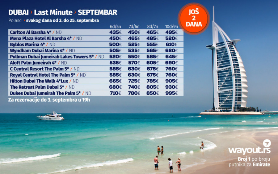 Kao što ste navikli prethodne jeseni i zime, uz neizbežan odmor na divnim plažama Arabijskog zaliva, preporučujemo putovanje u Dubai u septembru i oktobru. Za naše putnike smo izdvojili neke od najpopularnijih hotela sa najpristupačnijim cenama, a Dubai svakako važi za jednu od najsigurnijih i najorganizovanijih destinacija koje su se među prvima oporavile i nastavile normalno funkcionisanje nakon pandemije, a ako ste navikli da svoje putovanje u Dubai rezervišete preko turističkih portala, proverite naše paket aranžmane koji uključuju avio karte, transfere na destinaciji, smeštaj u vrhunskim hotelima, kao i usluge licenciranog vodiča na srpskom jeziku i uverite se u to da su naše cene najpovoljnije uz maksimalno kvalitetnu uslugu.