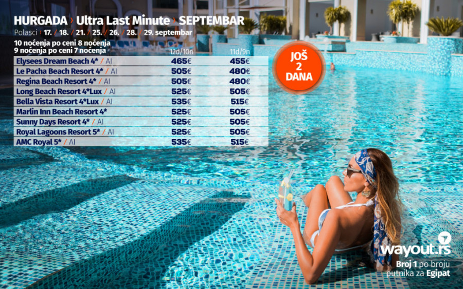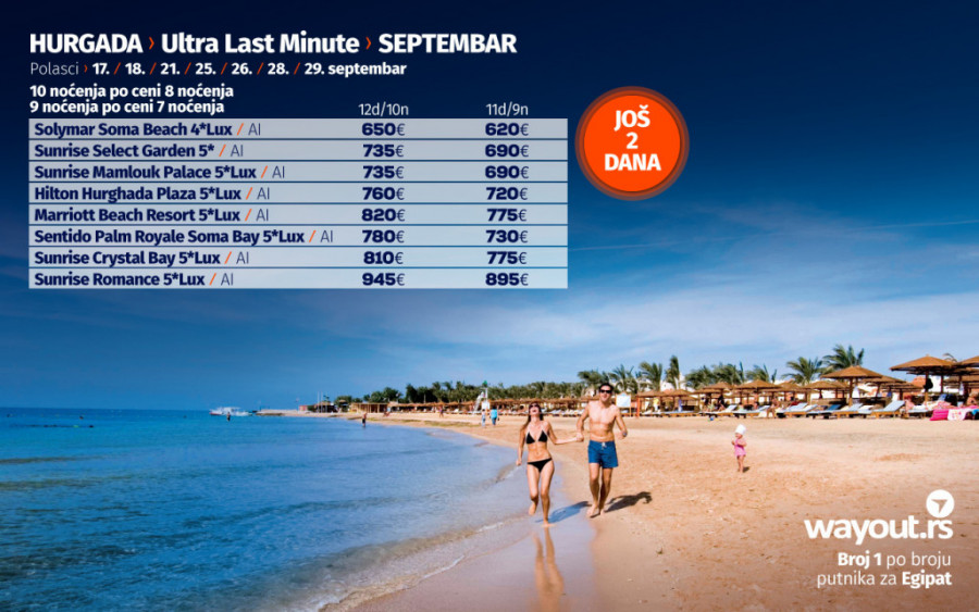 Ukoliko još uvek niste stigli da rezervišete svoje putovanje, bez mnogo razmišljanja, definitvno, najsigurniji i najpovoljniji izbor ove jeseni je Hurgada i odmor na prelepim plažama Crvenog mora, a za sve one koji bi da što pre pobegnu od svakodnevnih obaveza, spremili smo neodoljivu ponudu u vidu TOTALNE LETNJE RASPRODAJE za period putovanja u septembru i oktobru, sa posebnim akcentom na ULTRA LAST MINUTE ponudu za polaske 17. / 18. / 21. / 25. / 26. / 28. / 29. septembra.