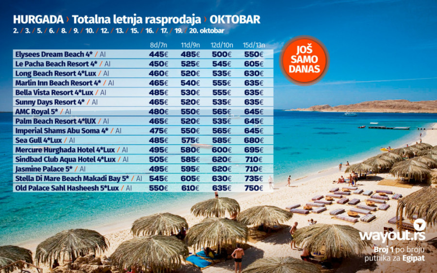 Pošto leto u Hurgadi traje tokom cele godine, za sve putnike smo spremili vrelu letnju rasprodaju za najsigurnije jesenje putovanje, a koja obuhvata totalnu rasprodaju za polaske u septembru i oktobru, kao i Ultra First Minute ponudu za polaske u novembru i decembru, sa najpovoljnijim cenama aranžmana do sada i sa najvećim izborom hotela na tržištu. Obzirom na to da će Hurgada i u narednim mesecima biti jedna od glavnih svetskih turističkih destinacija, svima preporučujemo da se što pre odluče za željeni termin i željeni hotel, kako bi svoj aranžman bukirali pre putnika iz ostalih evropskih zemalja kao što su Nemačka, Rumunija, Češka, Poljska, Ukrajina, Rusija, a sve to za samo 199eur po rezervaciji, dok je ostatak aranzmana potrebno isplatiti 15 dana pre putovanja...