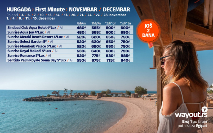 Jedan od pokazatelja da je Hurgada jedna od najsigurnijih turističkih destinacija, kao i iskustva putnika koji su prošle godine, u vreme pandemije putovali u Egipat, jeste to da su pojedini hoteli već izašli sa ponudom za polaske u novembru i decembru, a mi smo za sve naše putnike izdvojili najtraženije hotele po specijalnim Ultra First Minute cenama, a obzirom da je tražnja za putovanjima u Hurgadu ogromna, savetujemo da na vreme rezervišete svoje mesto i bez stresa sačekate svoje jesenje putovanje u novembru ili decembru sa najpovoljnijim cenama.