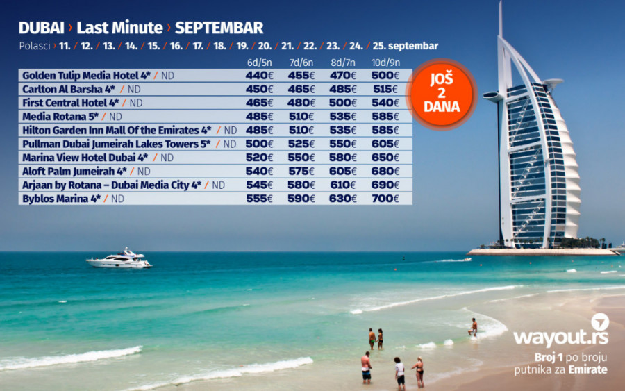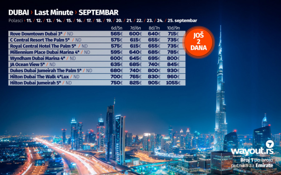Kao što ste navikli prethodne jeseni i zime, uz neizbežan odmor na divnim plažama Arabijskog zaliva, preporučujemo putovanje u Dubai u septembru i oktobru. Za naše putnike smo izdvojili neke od najpopularnijih hotela sa najpristupačnijim cenama, a Dubai svakako važi za jednu od najsigurnijih i najorganizovanijih destinacija koje su se među prvima oporavile i nastavile normalno funkcionisanje nakon pandemije, a ako ste navikli da svoje putovanje u Dubai rezervišete preko turističkih portala, proverite naše paket aranžmane koji uključuju avio karte, transfere na destinaciji, smeštaj u vrhunskim hotelima, kao i usluge licenciranog vodiča na srpskom jeziku i uverite se u to da su naše cene najpovoljnije uz maksimalno kvalitetnu uslugu.