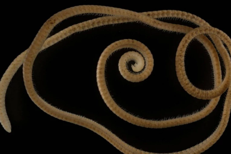 Vitki bledi dvonožac dostiže oko 95 mm u dužini i 0,95 mm u prečniku sa konusnom glavom, ustima u obliku kljuna i velikim pipcima - verovatno jedinim izvorom osećaja jer nema oči, rekli su naučnici u četvrtak.