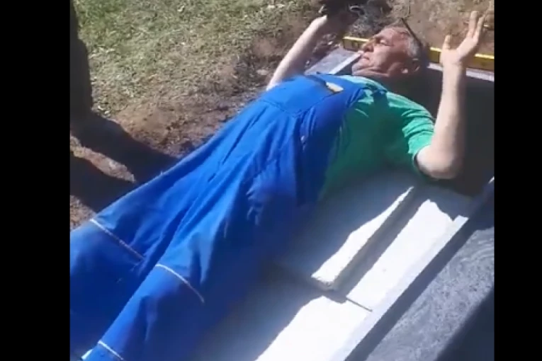 Tako je nastao snimak na kojem glavni junak “isprobava” grobnicu, dok dvojica radnika za njim nariču.